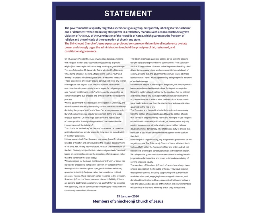 On 12 January, President Lee Jae-Myung stated during a meeting with religious leaders that “societal harm [caused by a specific religion] has been neglected for too long, resulting in great damage.” This was followed on 13 January by Prime Minister Kim Min-seok, who, during a Cabinet meeting, utilized terms such as “cult” and “heresy” to order a joint investigation and “eradication” measures.
